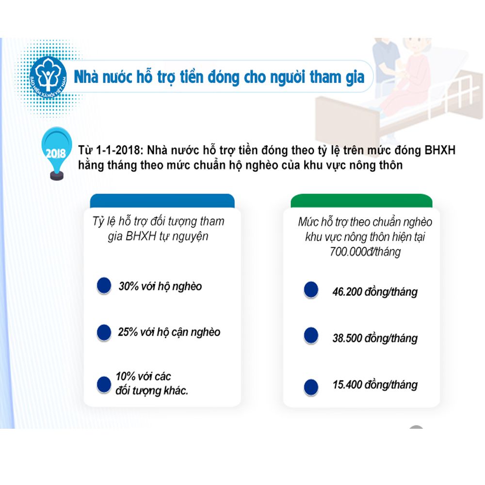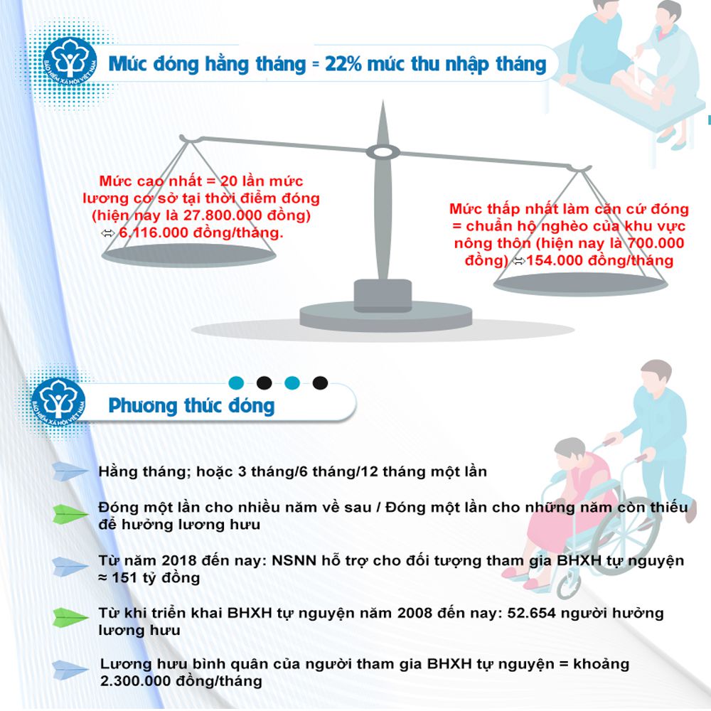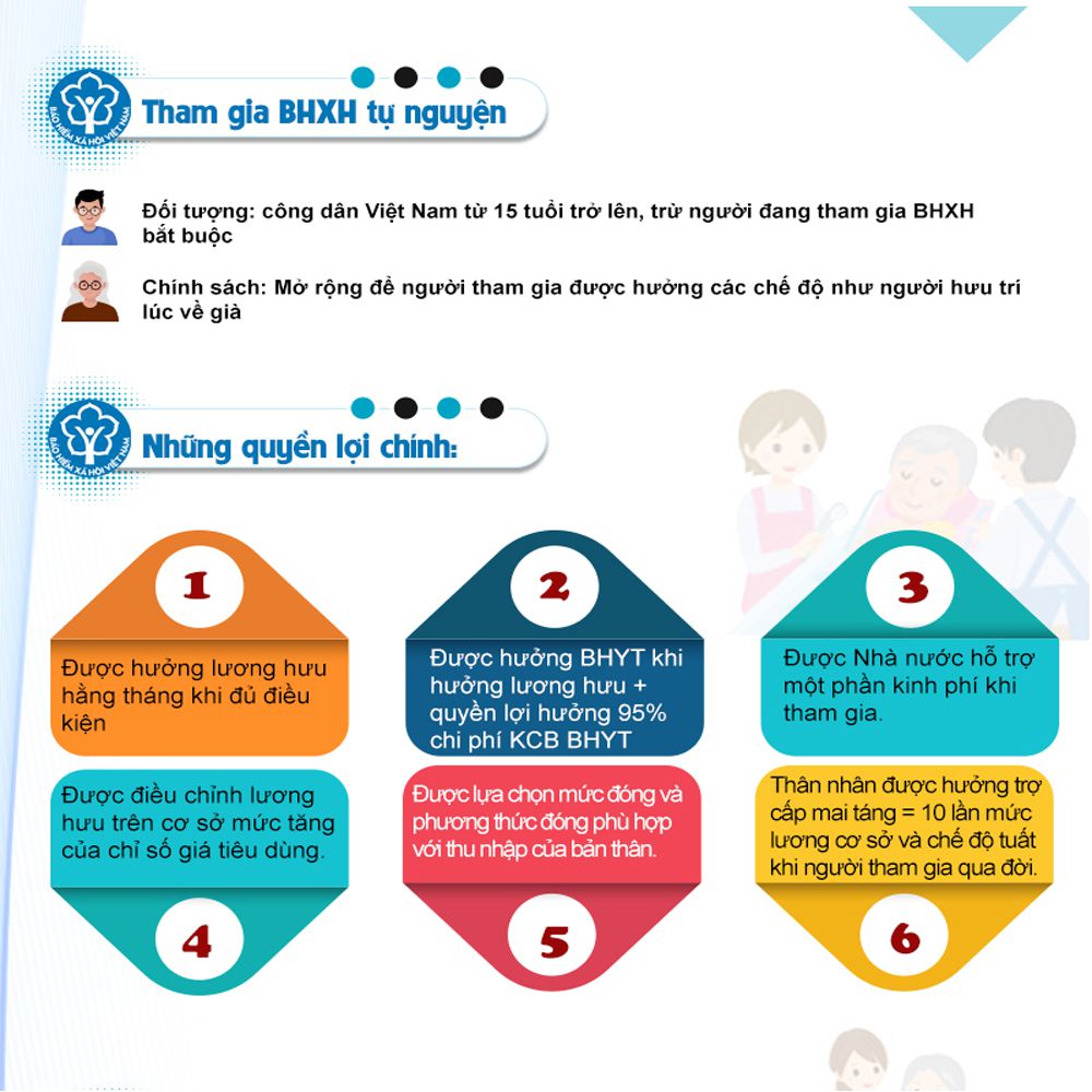 Khi tham gia bảo hiểm xã hội tự nguyện, người dân hưởng được những quyền lợi chính như lương hưu hằng tháng, bảo hiểm y tế miễn phí, được Nhà nước hỗ trợ một phần kinh phí khi tham gia, được lựa chọn mức đóng và phương thức đóng phù hợp với thu nhập của bản thân…