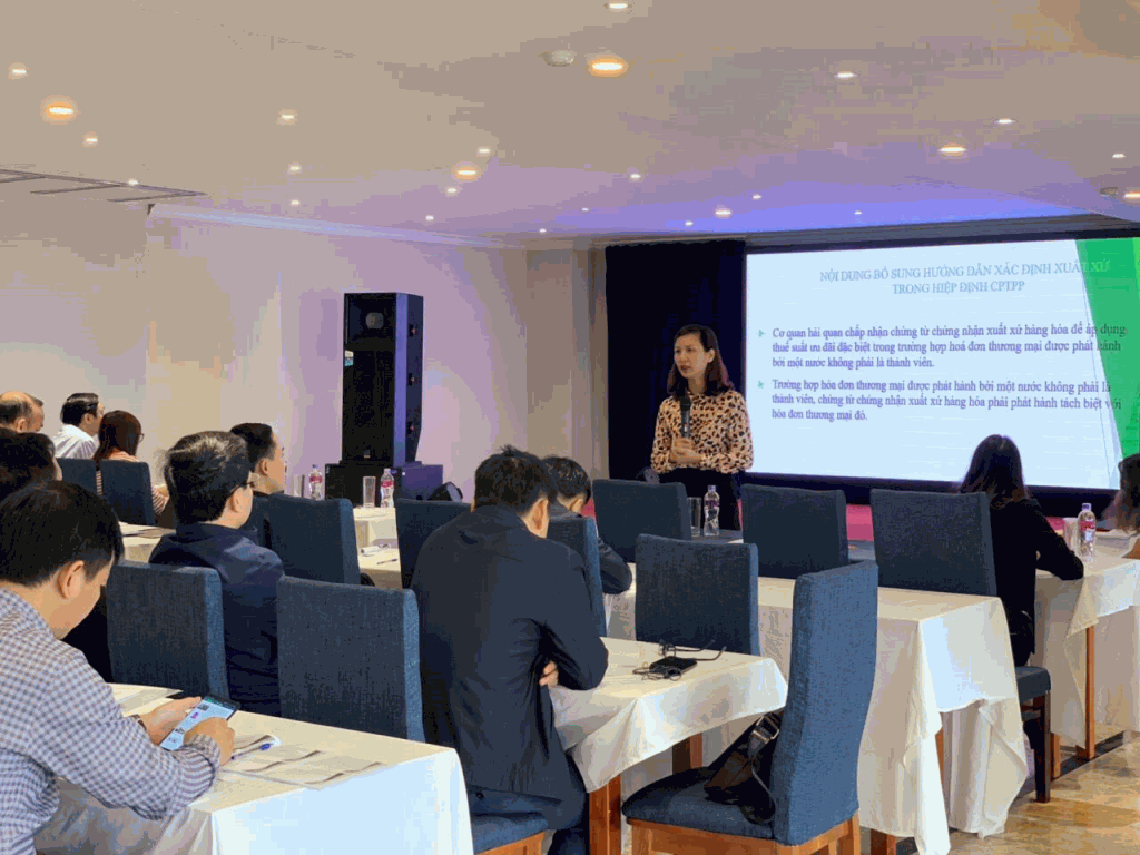 Tại hội nghị, đại diện Cục Giám sát quản lý về hải quan đã thông tin cụ thể về các điểm mới cần lưu ý tại Thông tư 62/2019/TT-BTC sửa đổi, bổ sung Thông tư 38/2019/TT-BTC, trong đó, tập trung vào các nội dung sửa đổi, bổ sung một số điều của Thông tư 38/2018/TT-BTC (Các trường hợp khác biệt nhỏ không ảnh hưởng đến tính hợp lệ của chứng từ chứng nhận xuất xứ hàng hóa; Từ chối chứng từ chứng nhận xuất xứ hàng hóa); bổ sung hướng dẫn kiểm tra xác định xuất xứ trong khuôn khổ Hiệp định CPTPP; sửa đổi, bổ sung Phụ lục II Danh mục hàng hóa NK phải nộp chứng từ chứng nhận xuất xứ hàng hóa cho cơ quan Hải quan.