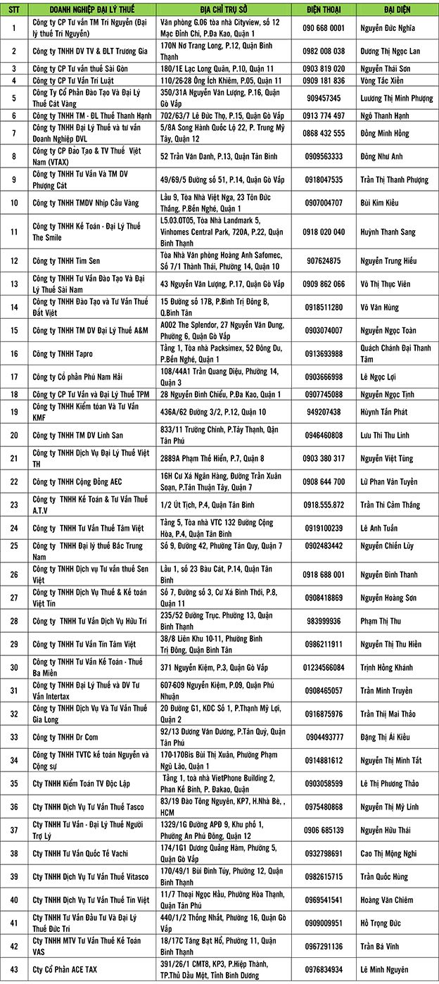 - Thông tin cụ thể danh sách các đại lý thuế cung cấp dịch vụ làm thủ tục về thuế trên địa bàn TP HCM nhằm tạo điều kiện thuận lợi giúp người nộp thuế thực hiện quyết toán thuế nhanh chóng, kịp thời, đúng quy định.