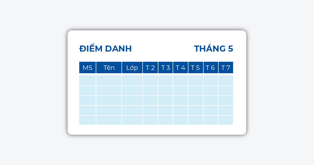 Quản lý điểm danh theo lớp học, tự động tạo báo cáo thông kê sau khi điểm danh. Điểm danh theo danh sách lớp học có sẵn, chỉ cần tích chọn học sinh vắng mặt, rất đơn giản và nhanh chóng.
